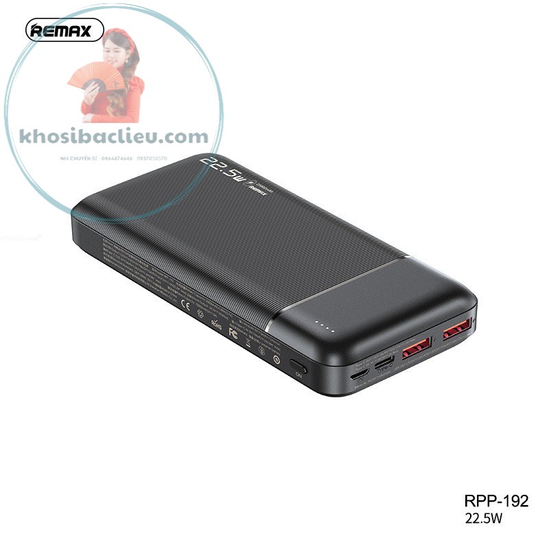 Pin Sạc Dự Phòng Remax RPP-192 20000mAh 2 Inputs, 3 Outputs, (TypeC PD 18W, USB 22.5W, VOOC)BH 12 Tháng bằng tem dán trên pin