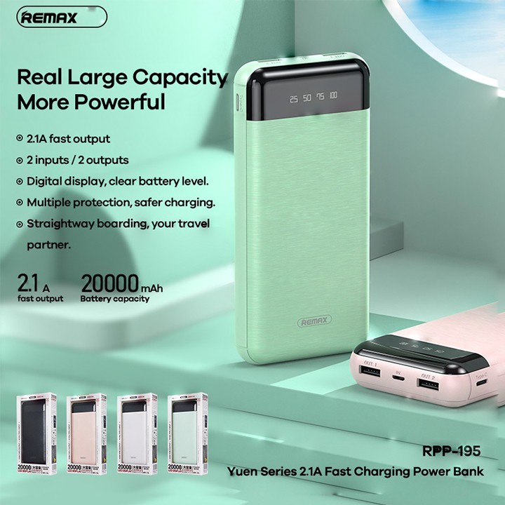 Pin sạc dự phòng Remax RPP-195 20000mAh 2 cổng USB tích hợp màn hình LED hiển thị dung lượng được tích hợp 2 cổng USB