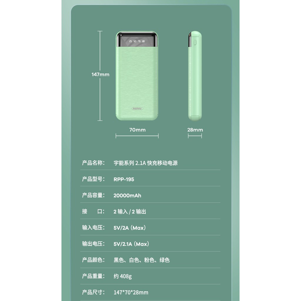 Pin sạc dự phòng REMAX RPP-195 với thiết kế đơn giản với hiệu suất vượt trội. Cùng với dung lượng 20.000mAh giúp bạn sạc được thiết bị lâu hơn nhiều hơn - bạn có thể sử dụng thoải mái và di chuyển dễ dàng.