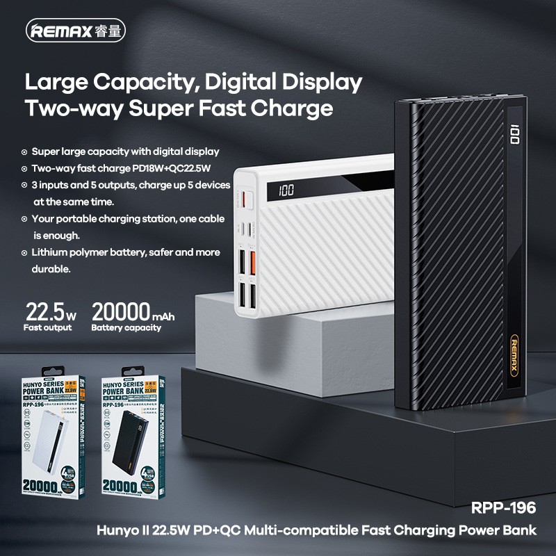 Giới thiệu Pin sạc dự phòng Remax RPP-196 20000mAh QC22.5W PD18W, 3 Inputs 5 Outputs, lõi Li-Polymer - Hãng phân phối