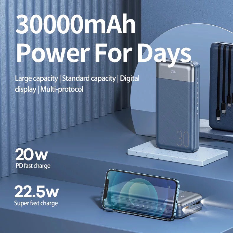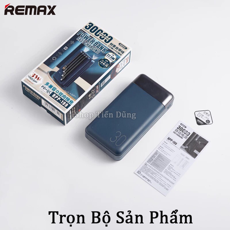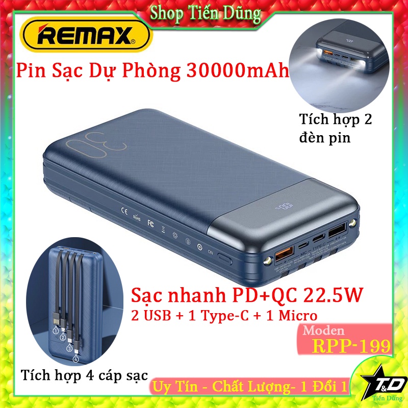 Pin Sạc Dự Phòng Remax RPP 199 Dung Lượng 30000mAh Tích Hợp 4 Loại Cáp USB - Type-C - Micro - Lightning, Đèn Pin, Sạc Nhanh 22.5W.💪Chi tiết nhanh sạc dự phòng Remax RPP-199