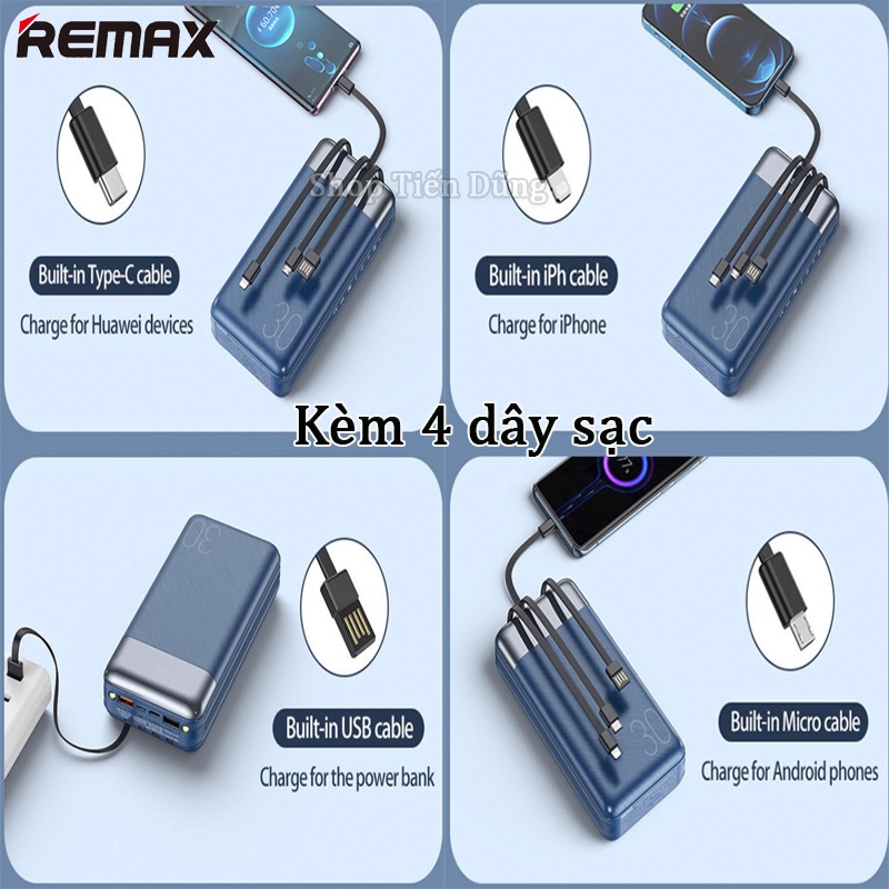 Pin Sạc Dự Phòng Remax RPP 199 Dung Lượng 30000mAh Tích Hợp 4 Loại Cáp USB - Type-C - Micro - Lightning, Đèn Pin