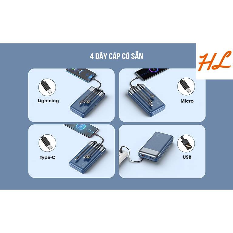 Với ưu điểm 3 cổng sạc vào MicroUSB, TypeC, Lightning mang lại sự tiện lợi hơn bao giờ hết. Bạn có thẻ dùng bất kì cáp sạc nào trong 3 cổng trên để sạc cho pin.