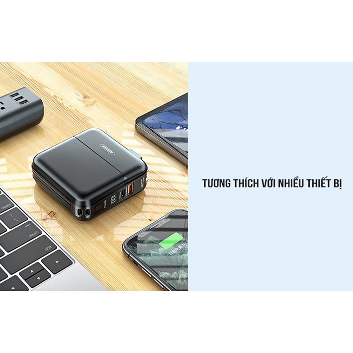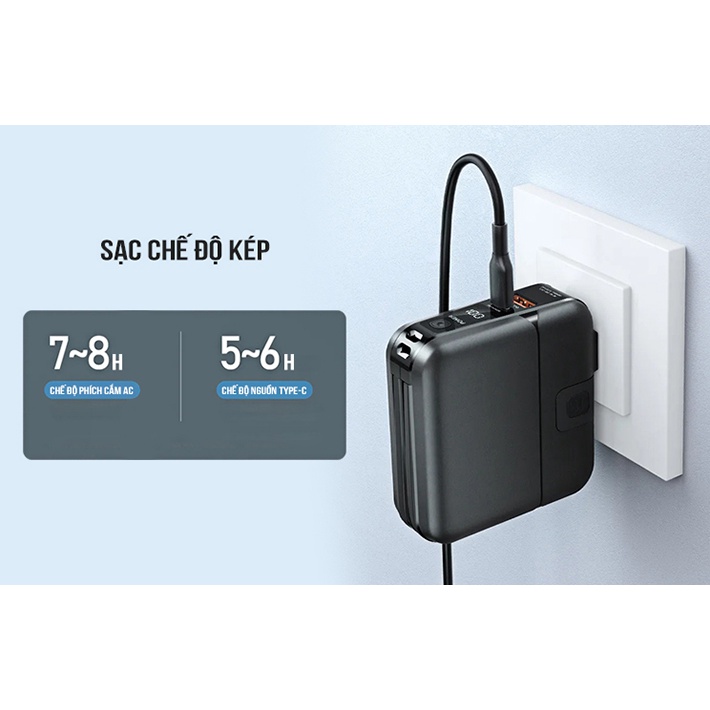 - Dù thiết kế nhỏ gọn, nhưng cục pin sạc dự phòng đa năng này lại tích hợp rất nhiều cổng sạc, dây sạc và chân cắm AC xung quanh: