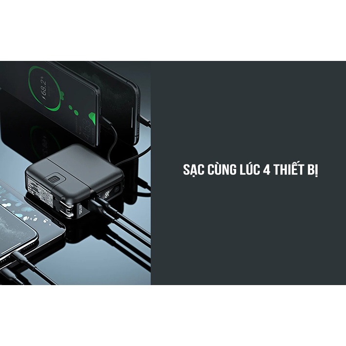 Cổng ra : 1 cổng USB ( QC3.0 /18W) , 1 cổng TYpe-C (QC3.0/18W) , 1 Dây sạc lightning , 1 dây sạc Type-C