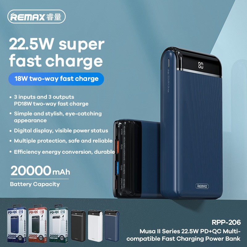 Giới thiệu Pin sạc dự phòng Remax RPP-206 20000mAh 3 Inputs 3 Outputs TypeC PD18W USB 22.5W - Hãng phân phối