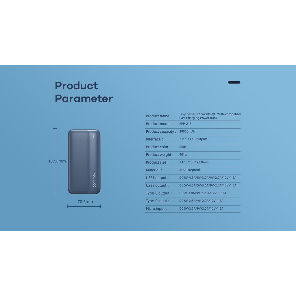 Pin sạc dự phòng Remax RPP-213 20000mAh 2 Inputs, 3 Outputs, TypeC PD 20W, USB 22.5W (Xanh) - Nhất Tín ComputerThông số: