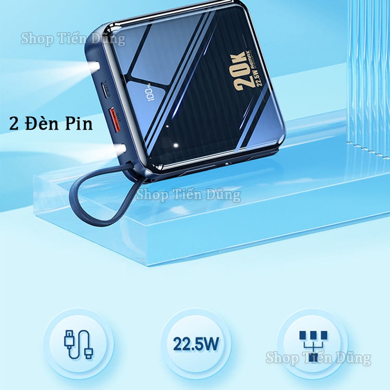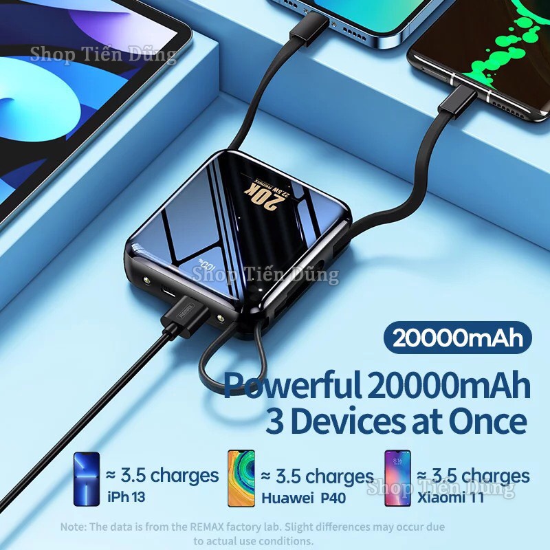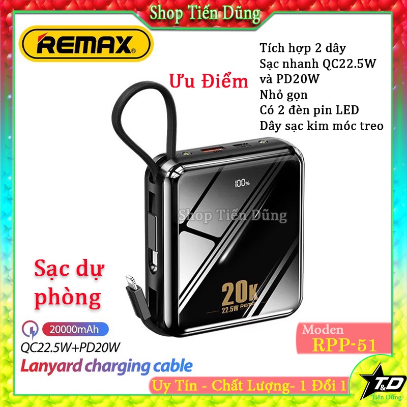 Pin Sạc Dự Phòng Remax RPP 51 Dung Lượng 20000mAh Sạc Nhanh PD20W 22.5W Loại Kèm 2 Dây Sạc Lighning và Type-C Nhỏ Gọn