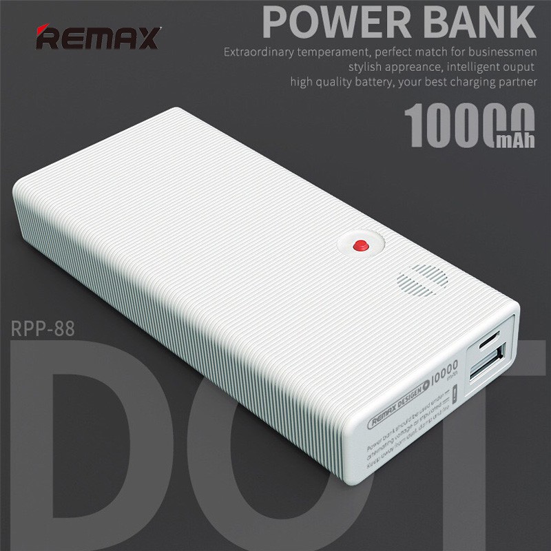 - Pin sạc dự phòng Remax RPP - 88 với thiết kế đơn giản, thanh lịch, dung lượng pin 10.000mAh chắc chắn sẽ tiện lợi hơn cho bạn khi dùng.