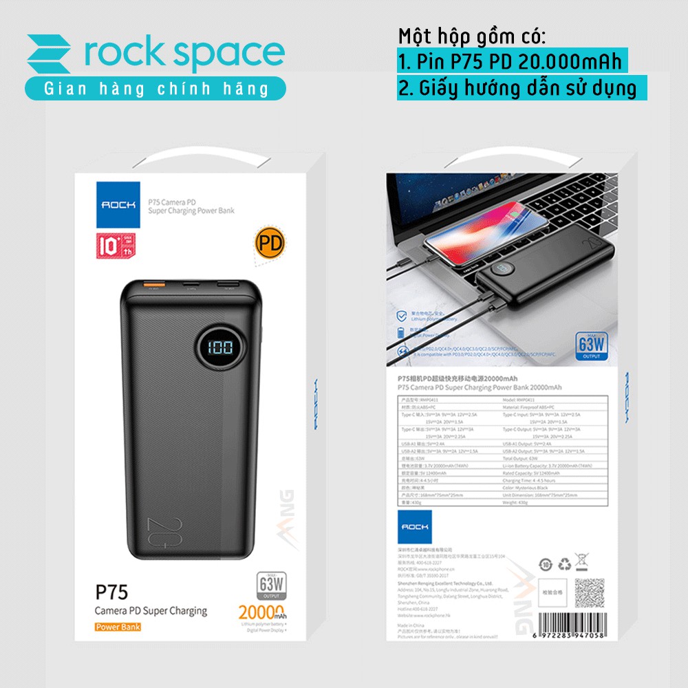 Điện Thoại & Phụ Kiện > Phụ kiện > Sạc dự phòng & Pin > Sạc dự phòng || Pin sạc dự phòng Rockspace P75 20.000mAh 63W sạc được laptop hỗ trợ sạc nhanh chuẩn PD cho iphone,QC cho SamsungCòn hàng