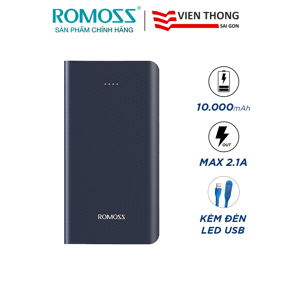Pin sạc dự phòng Romoss Sense 10 10.000mAh cao cấp tặng đèn LED USB