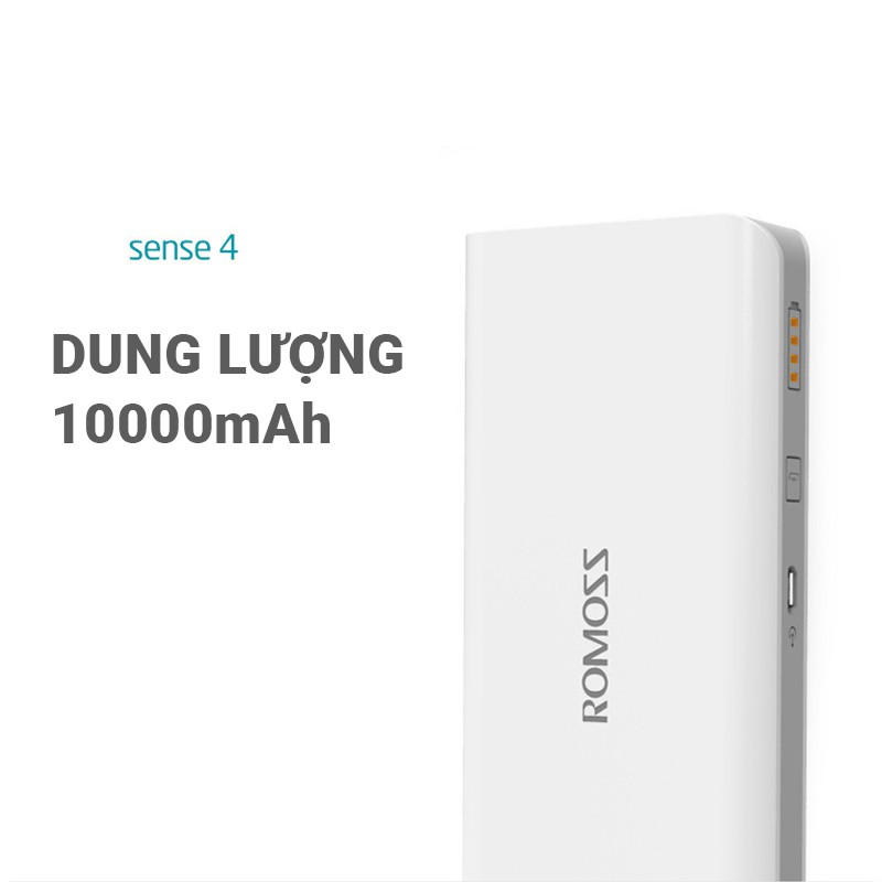 Pin sạc dự phòng Romoss Sense 4 10000mAh có 2 cổng sạc ra USB, 1 cổng sạc vào Micro hỗ trợ sạc nhanh tốc độ 2.1A nhỏ gọn