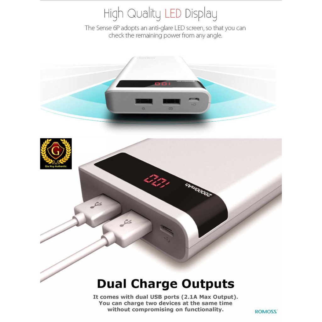 Romoss Sense 6P là dòng pin dự phòng giá rẻ tích hợp hai cổng USB-A giúp cho bạn có thể sạc hai thiết bị cùng lúc mà rất an toàn. Với thiết kế này bạn có thể vừa sạc điện thoại di động và vừa sạc một chiếc tabnet hay một vài thiết bị kỹ thuật số khác. tiện lợi "một công đôi việc".