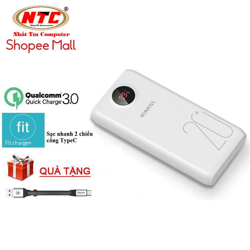 Pin sạc dự phòng Romoss SW20 Pro 20000mAh hỗ trợ sạc nhanh QC 3.0 và PD 18W TypeC (Trắng) + Tặng cáp Baseus 1 đầu 2 chân