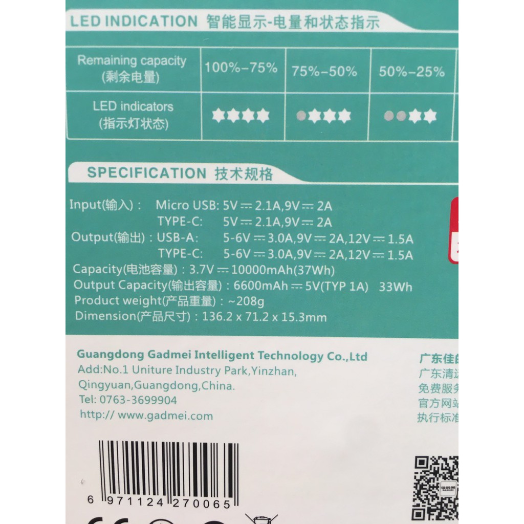 Model: PIN SAC 10000MAH GADMEI (PD1020) Type C hỗ trợ sạc nhanh lên đến 18W cực nhanhPIN SAC 10000MAH GADMEI (PD1020)