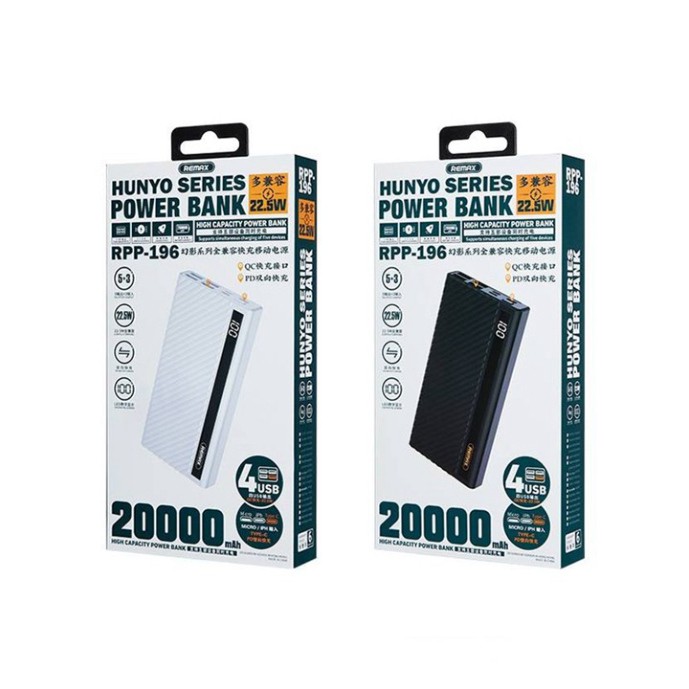 + Tên sản phẩm: Pin sạc dự phòng Hunyo series II Remax RPP-196 20000mAh sạc nhanh PD QC3.0 4 cổng USB max 22.5W