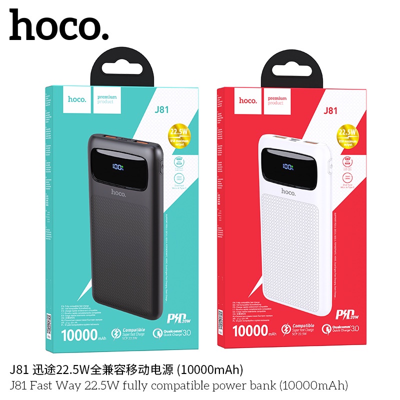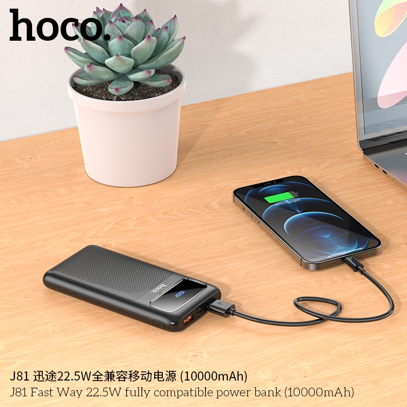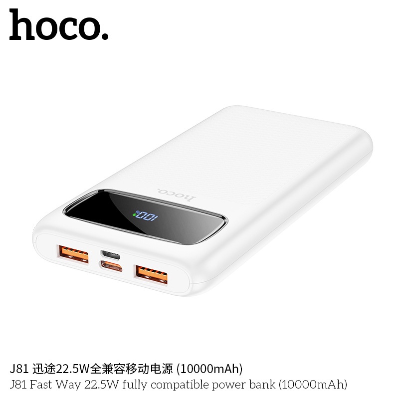 ✔️Sạc dự phòng Hoco J81 hỗ trợ sạc nhanh công suất PD22.5W siêu tốc, dung lượng 10000mAh, công suất tiêu thụ khi sạc đạt 70%, có thể sạc đầy từ 2-2,5 lần cho điện thoại dung lượng pin 3000mAh (như iPhone XS Max hoặc Samsung S10 Plus) tích hợp 2 cổng ra USB, 2 cổng vào MicroUSB và Type C để cắm điện cho SDP này, trên J81 có đèn báo hiển thị vạch pin. J81 sạc cho tất cả các thiết bị điện thoại Smartphone và máy tính bảng