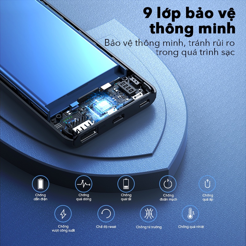 ◼ 9 lớp bảo vệ an toàn, sạc nhanh không hỏng máy, bao gồm: Chống sạc quá mức, chống chập, chống quá áp, chống quá dòng, chống quá tải, chống đoản mạch, chống vượt công suất, chống quá nhiệt.