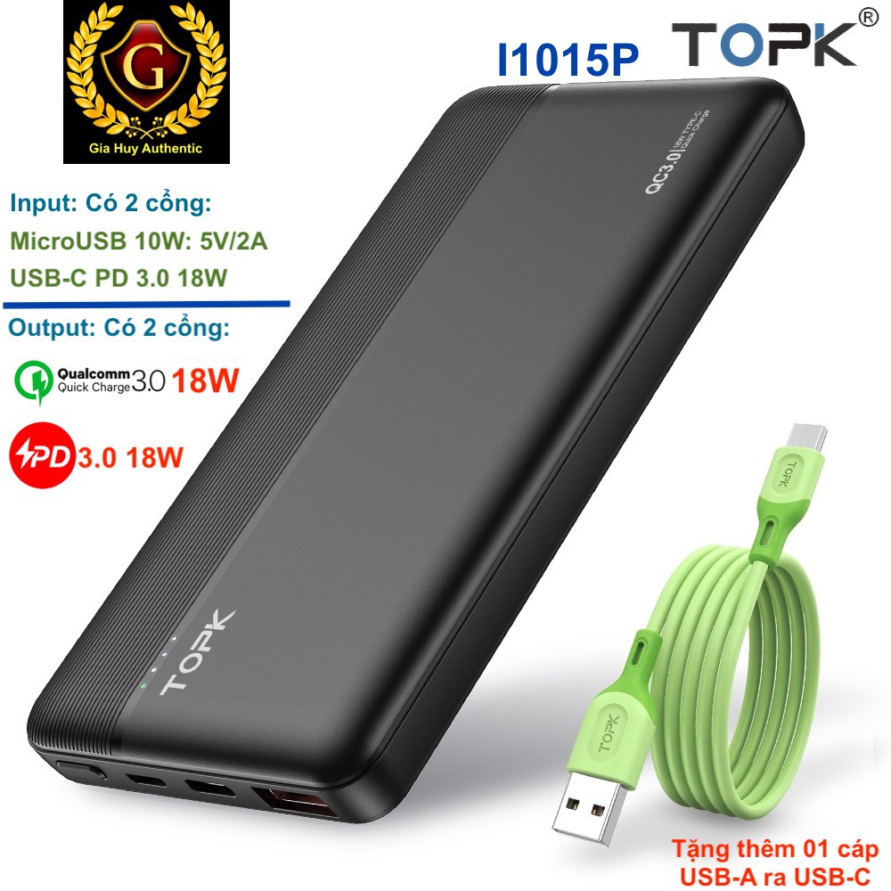 Công nghệ sạc nhanh PD 3.0 ở cổng Type-C hoàn toàn thương thích QC 3.0. Chính vì vậy, bạn có thể sạc lại cho Pin TOPK I1015P bằng cáp C to C chung với củ sạc PD 18W, hoặc dùng cáp A to C chung với củ sạc QC 3.0 18W)