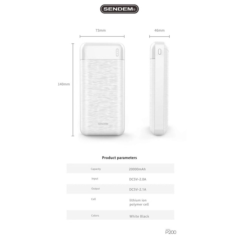 *** Mẫu sạc dự phòng mới của SENDEM 2020, sạc dự phòng 20000mAh P200 chất lượng giá lại tốt *** Sạc dự phòng SENDEM P200 hỗ trợ đầy đủ cho điện thoại di động chính trên thị trường cho phép bạn đi lại dễ dàng, sạc pin bất cứ lúc nào *** Nhẹ, di động và tiết kiệm không gian, cảm giác tốt khi chạm vào *** Đầu ra 2 cổng USB sạc nhanh 2.1A, giúp sạc 2 điện thoại cùng lúc *** Chất liệu pin bằng polymer thông minh an toàn, chống cháy nổGiá BTCF
