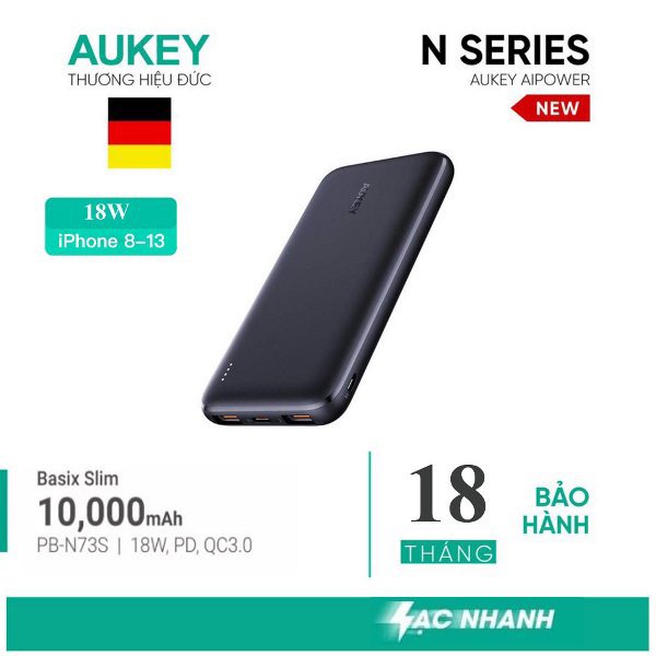 Pin Sạc Dự Phòng Siêu Mỏng 10.000 mAh Aukey PB-N73S là sản phẩm thuộc thương hiệu Aukey đến từ Đức. Sạc hai chiều với cổng USB Power Delivery. Sạc nhanh gấp 4 lần với 1 cổng PD 18W. Dung lượng lớn lên tới 10000mAh và tương thích với hầu hết các thiết bị