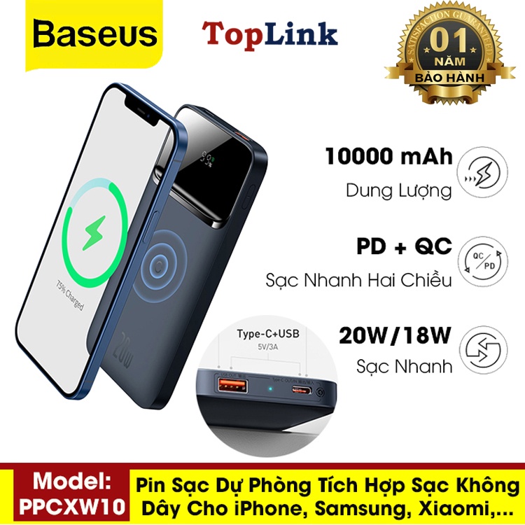 Pin Sạc Dự Phòng 10000mah Baseus Sạc Siêu Nhanh 20W Có Dây Và 10W Không Dây Tích Hợp Nam Châm - TopLink