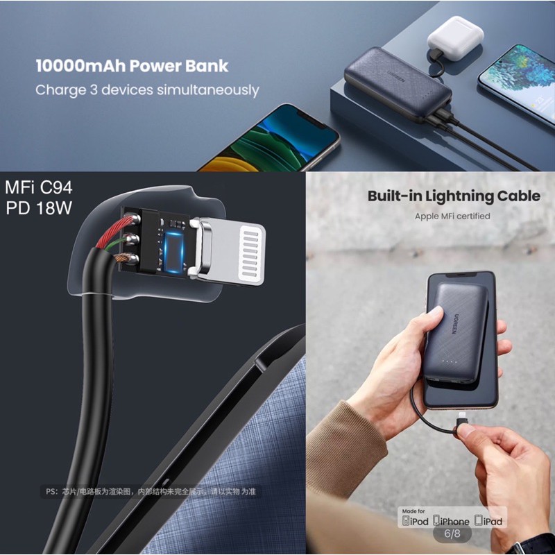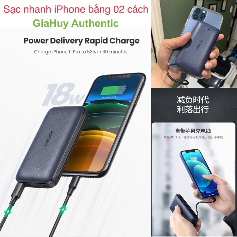Giới thiệu Pin sạc dự phòng tích hợp Cáp Lightning PD 18W MFi C94 UGREEN PB172 10000mAh PD 18W & QC 3.0 18W