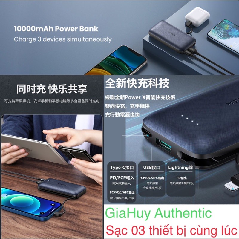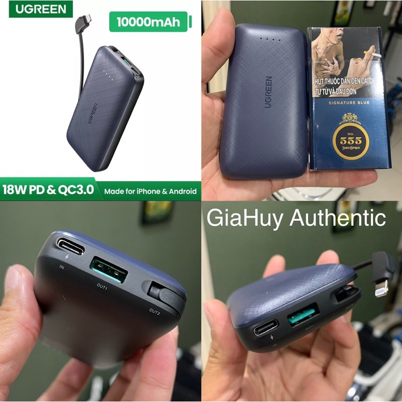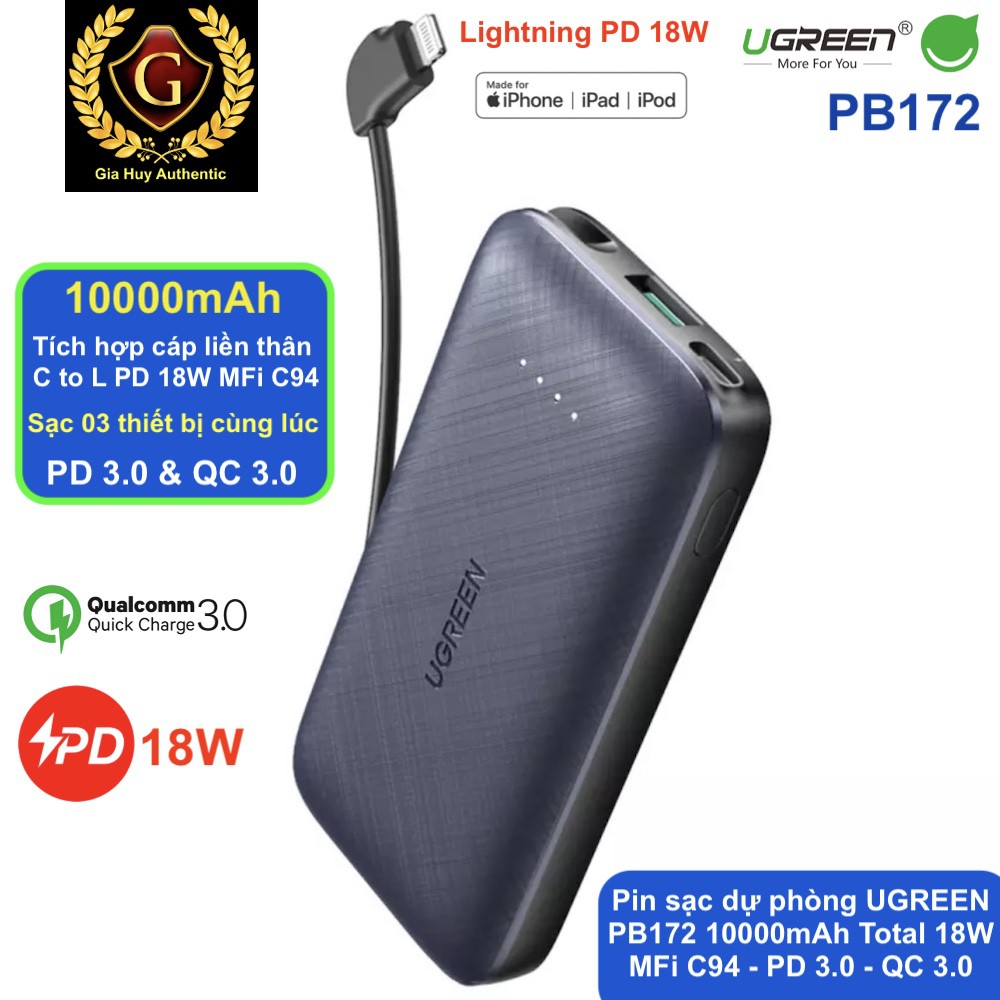 Pin sạc dự phòng tích hợp Cáp Lightning PD 18W MFi C94 UGREEN PB172 10000mAh PD 18W & QC 3.0 18W