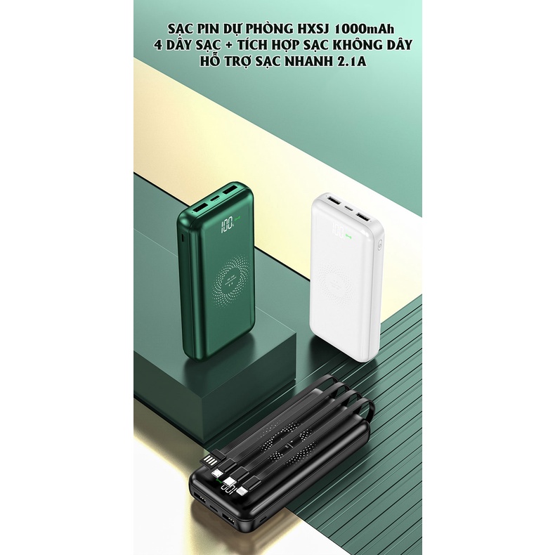 Pin sạc dự phòng Tích hợp sạc không dây HXSJ 10000mAh, Hỗ trợ sạc nhanh cổng usb 2.1A Kèm sẵn 4 đầu sạc tiện lợi
