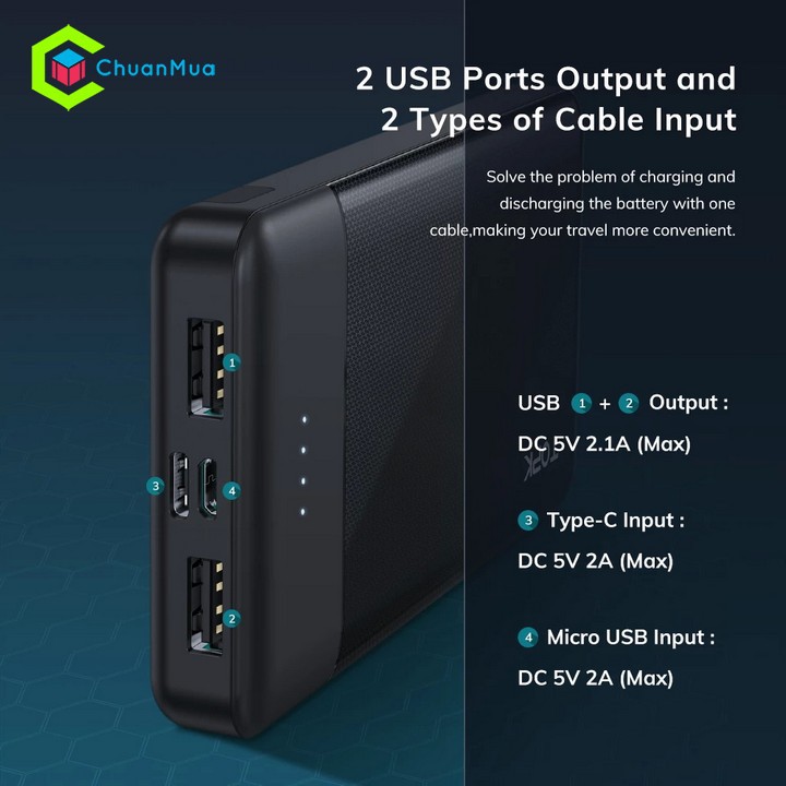 Đầu ra 2 cổng USB và 2 loại cáp đầu vào, giải quyết vấn đề sạc và xả pin chỉ với một dây cáp, giúp việc di chuyển của bạn thuận tiện hơn