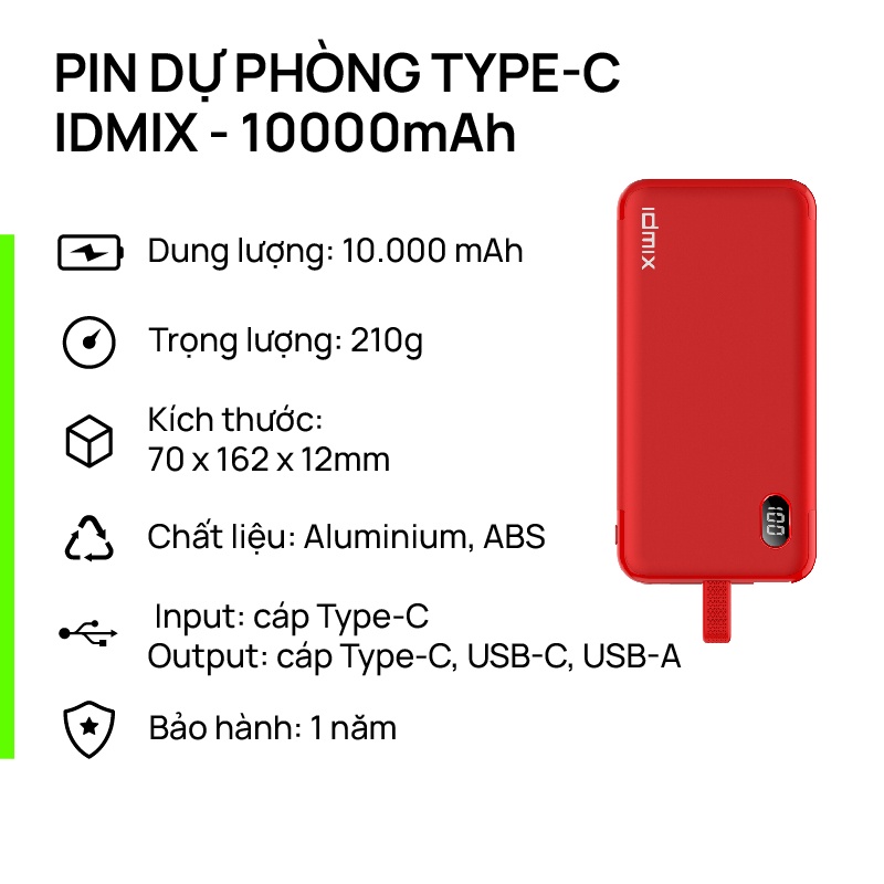 Pin sạc dự phòng Type-C IDMIX – dung lượng 10.000 mAh thiết kế mỏng nhẹ, hỗ trợ sạc nhanh, bảo hành 12 tháng