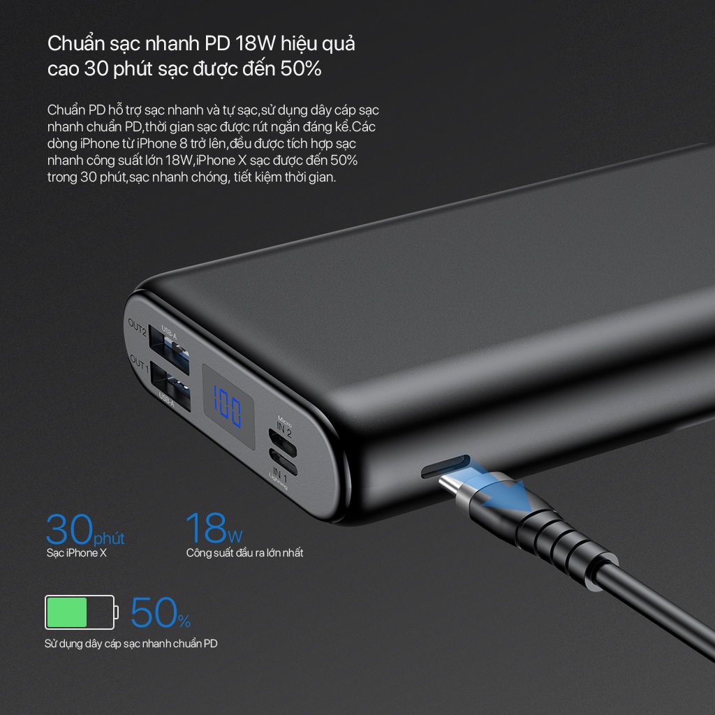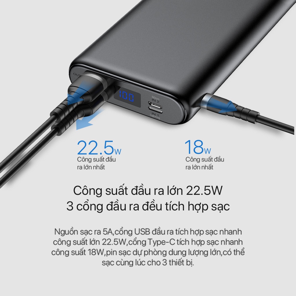 ✔ Nguồn sạc ra 5A, cổng USB đầu ra tích hợp sạc nhanh công suất lớn 22.5W, cổng Type-C tích hợp sạc nhanh công suất 18W, pin sạc dự phòng dung lượng lớn, có thể sạc cùng lúc cho 3 thiết bị.