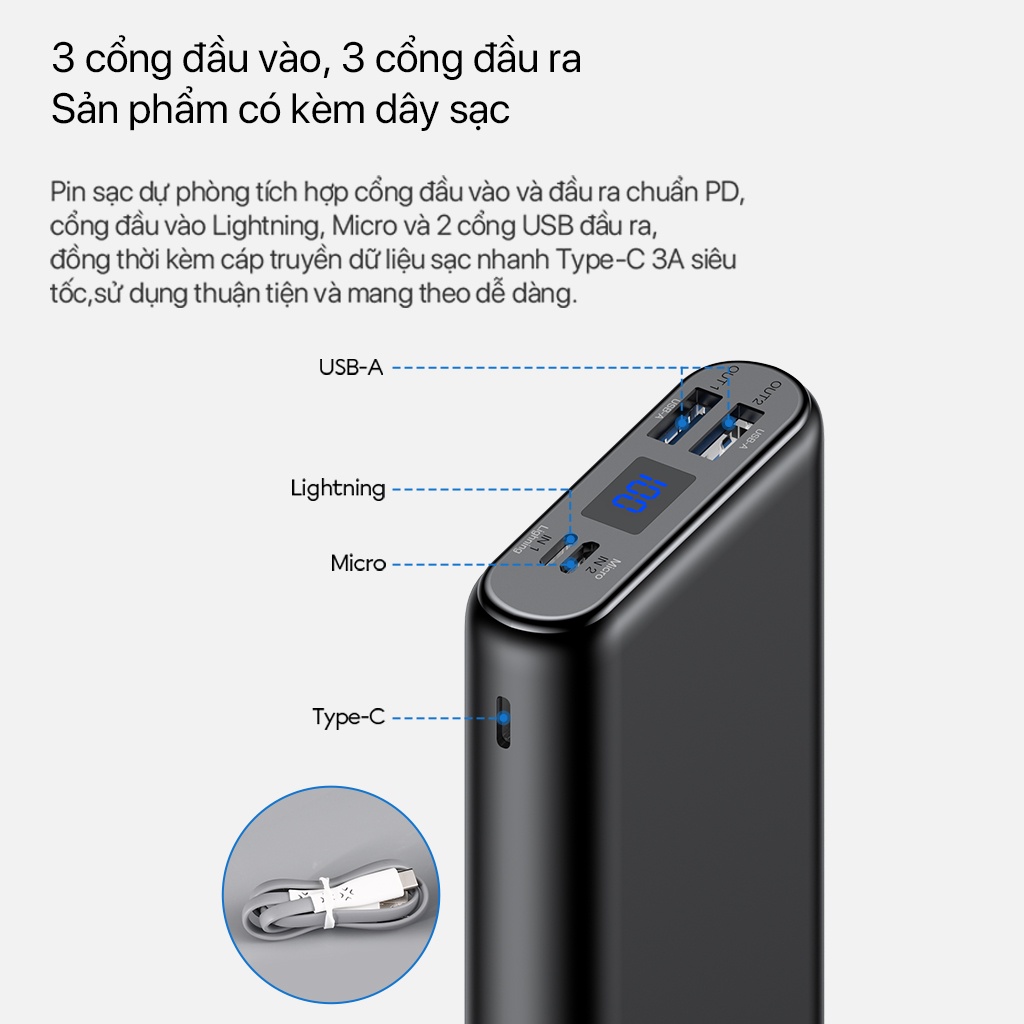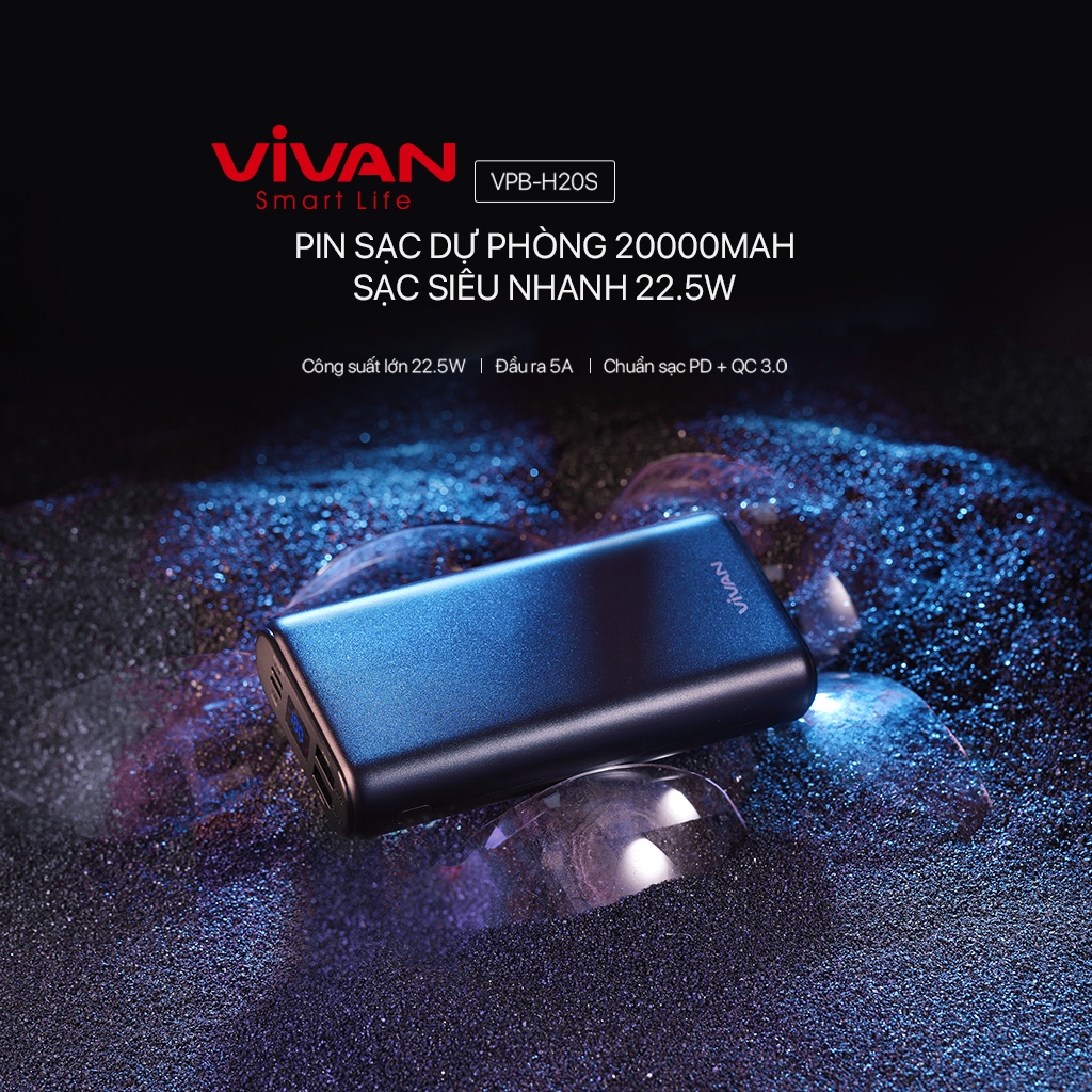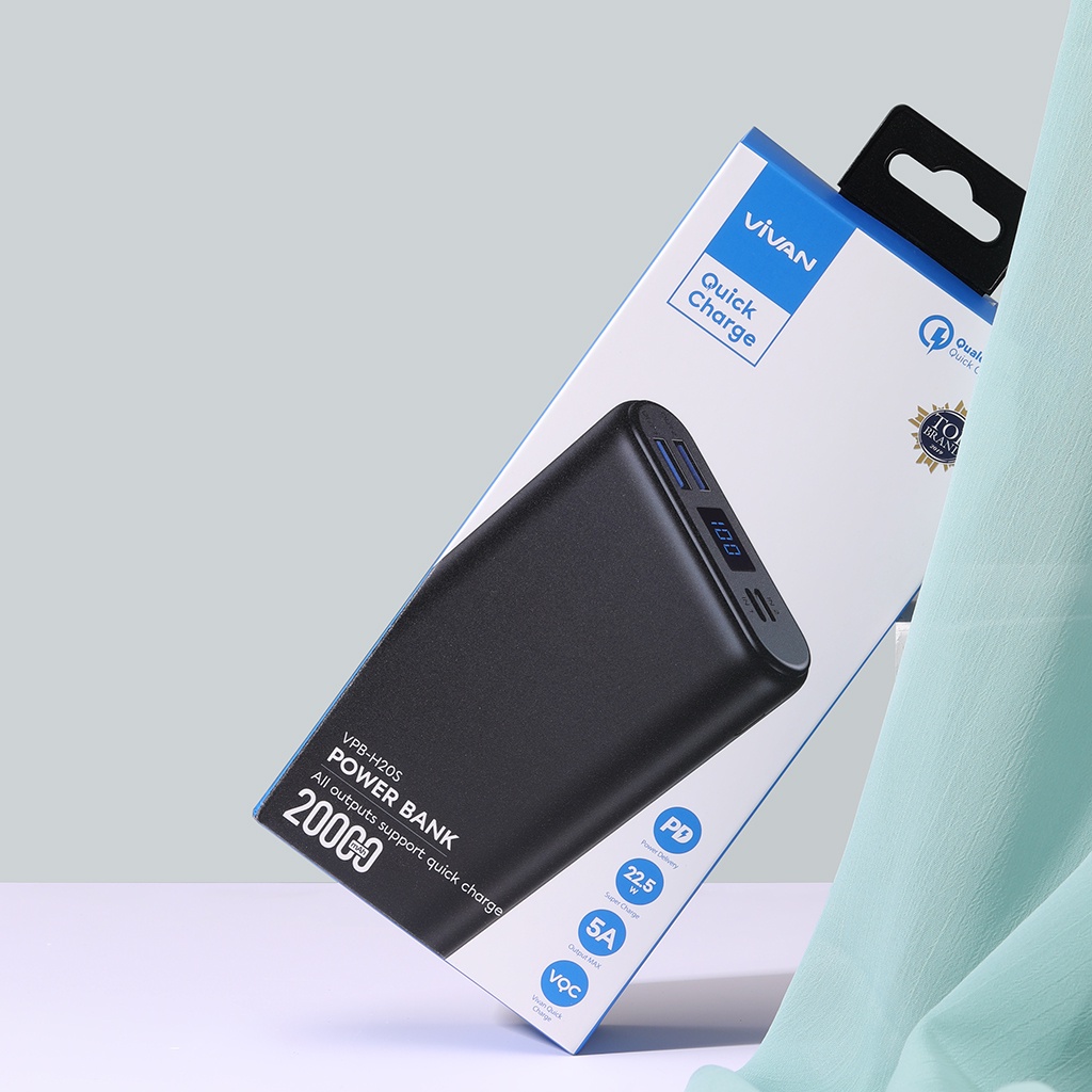 Pin Sạc Dự Phòng VIVAN VPB-H20S 20.000mAh, 3 Output & 3 Input 22.5W Quick Charge LED Hiển Thị Pin, kèm cáp sạcPin sạc dự phòng tích hợp cổng đầu vào và đầu ra chuẩn PD, cổng đầu vào Lightning, Micro và 2 cổng USB đầu ra, kèm cáp truyền dữ liệu sạc nhanh Type-C 3A siêu tốc.