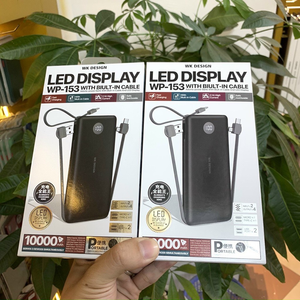 Sạc dự phòng WP-153 10000MAH - kèm 3 đàu sạcPin sạc dự phòng tích hợp cáp đi kèm (Chân iphone/chân micro/chân type C) WK WP-153 Dung lượng lớn 10000mAh