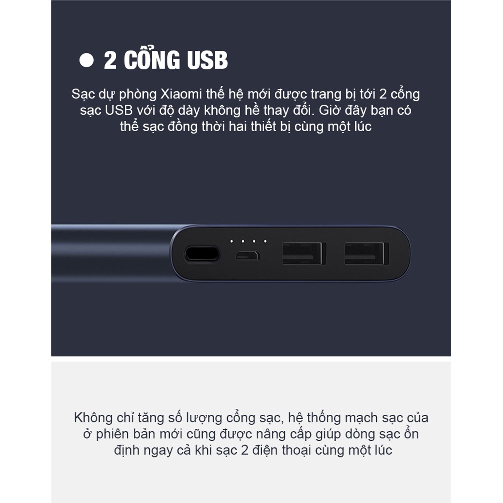 - Sạc dự phòng Xiaomi Gen 3 10000mAh hỗ trợ 2 cổng sạc ra USB-A đáp ứng nhu cầu sạc cùng lúc hai thiết bị. Bạn sẽ yên tâm sử dụng cả hai thiết bị mà không phải lo thiếu cổng sạc.