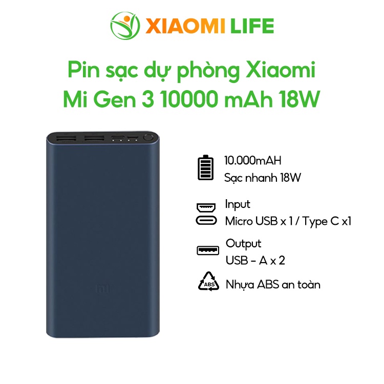Điện Thoại & Phụ Kiện > Phụ kiện > Sạc dự phòng & Pin > Sạc dự phòng || Pin Sạc Dự Phòng Xiaomi Mi Gen 3 10.000 mAh Hỗ trợ sạc nhanh Type-C 18W - Hàng Quốc TếCòn hàng