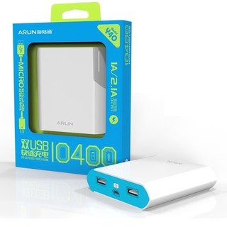 Sạc dự phòng Arun 10400 mAh sử dụng nguồn vào 5V-1A và cho nguồn ra tối đa 5V-2.1A, tương thích với hầu hết các loại pin của smartphone.