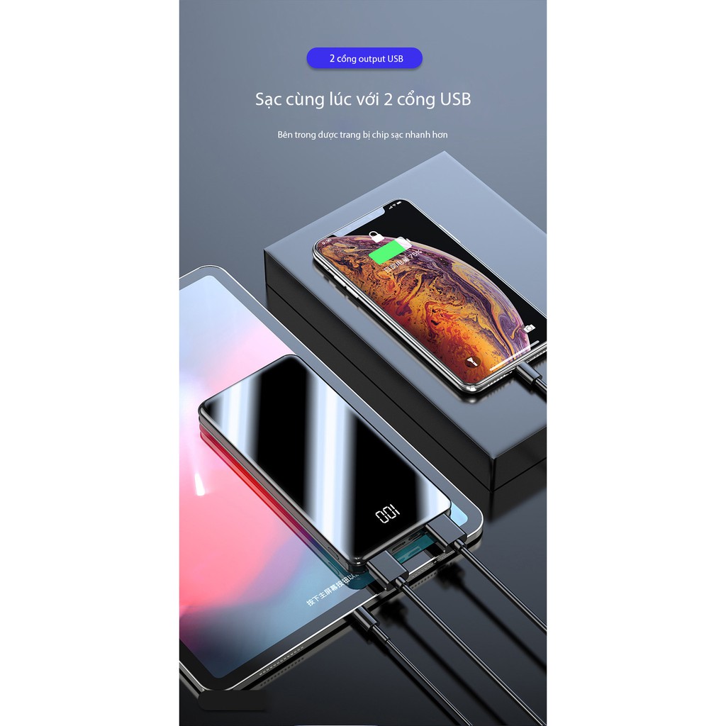Pin sạc dự phòng Y43B dung lượng 15000mAh mặt kính hiện đại có hiển thị lượng pin 2 Cổng USB 2 cổng Input