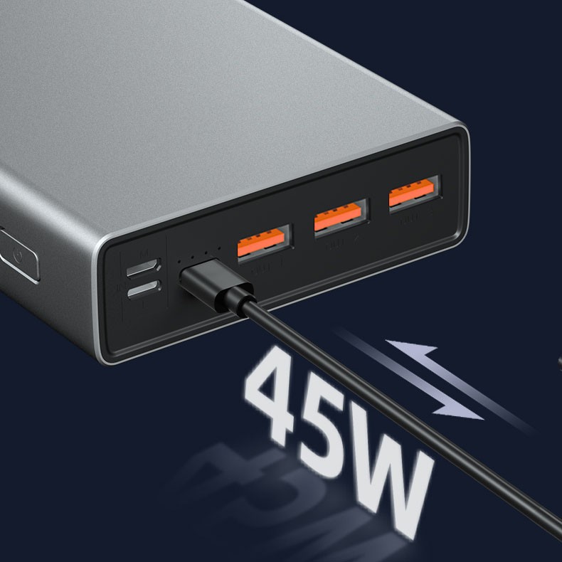 Với 4 cổng ra, Yoobao 99Wh có thể sạc pin cho 4 thiết bị cùng lúc mà không cần phải chờ đợi. 3 cổng ra USB-A (màu cam) hỗ trợ giao thức sạc nhanh Qualcomm Quick Charge 3.0 (QC 3.0). Cổng ra Type-C hỗ trợ sạc nhanh 45W Power Delivery (PD), nó cũng có thể hoạt động như một cổng vào với công suất đầu vào tối đa 45W, sạc siêu nhanh.