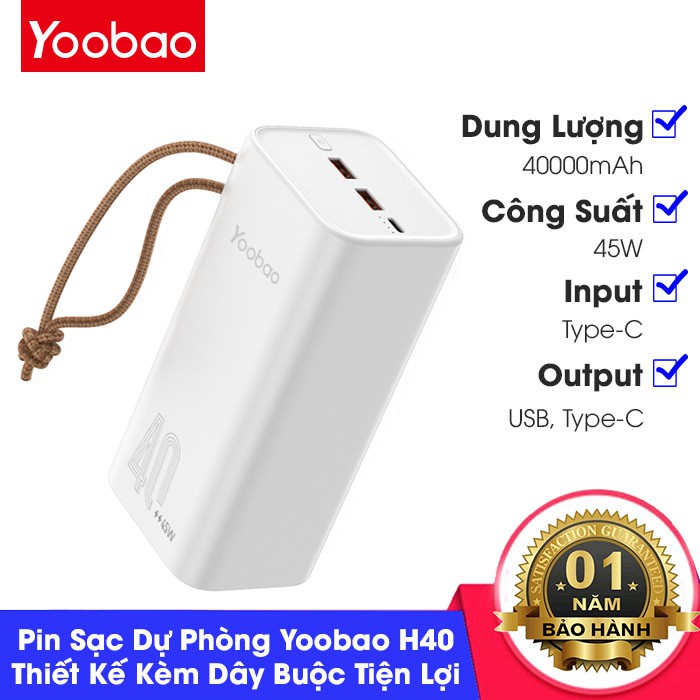 Điện Thoại & Phụ Kiện > Phụ kiện > Sạc dự phòng & Pin > Sạc dự phòng || Pin sạc dự phòng Yoobao H40, dung lượng 40000mAh, công suất 45W sạc nhanh cho điện thoại, macbook, laptopCòn hàng