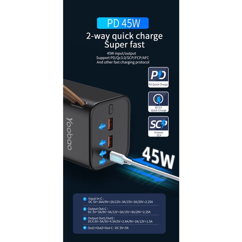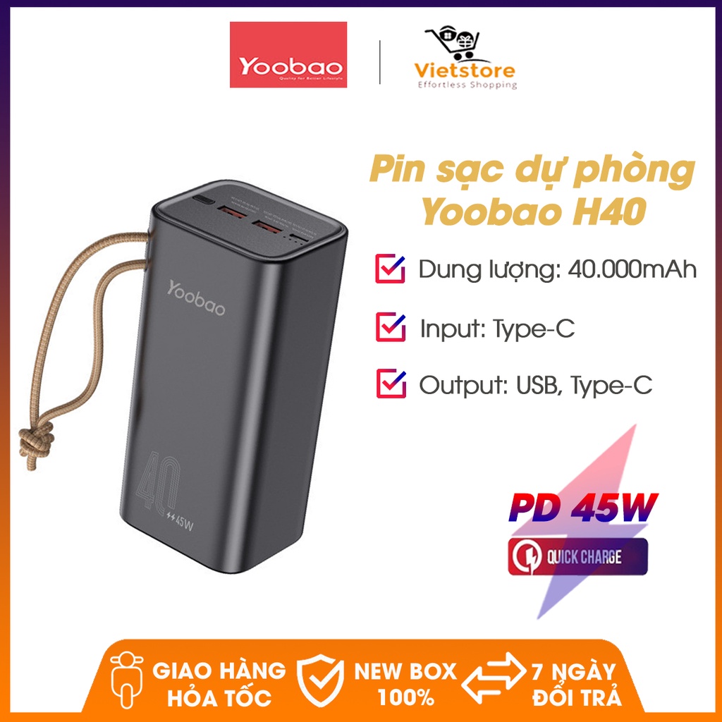 Điện Thoại & Phụ Kiện > Phụ kiện > Sạc dự phòng & Pin > Sạc dự phòng || Pin sạc dự phòng Yoobao H40, dung lượng 40000mAh, công suất 45W sạc nhanh cho điện thoại , macbook, laptopCòn hàng