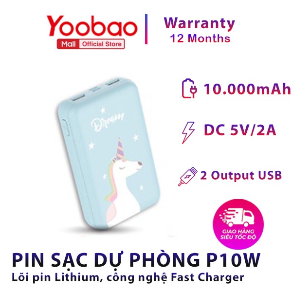 Pin sạc dự phòng Yoobao P10W cung cấp khả năng sạc đồng thời 2 cổng USB với dung lượng lớn 10000mAh, pin sạc tích hợp đèn LED siêu sáng tiện lợi cho người dùng.