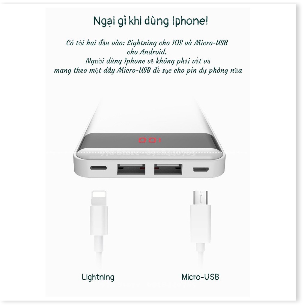 ✔ Hai cổng đầu vào có thể sạc pin dự phòng bằng dây Lightning của Iphone hoặc Micro-USB của Android