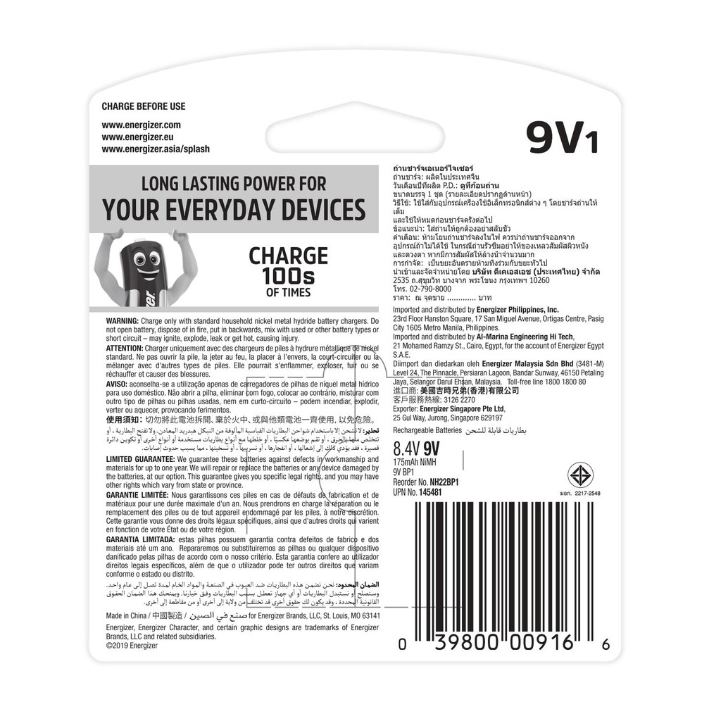 Tên sản phẩm: PIN SẠC VUÔNG 9V ENERGIZER NH22 BP1Số lượng: 1 viên.