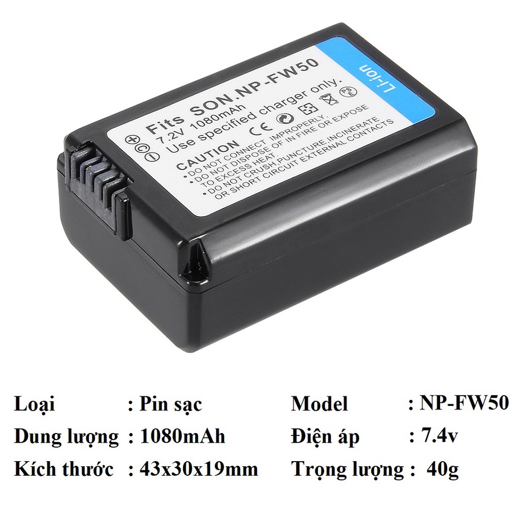 Pin sạc NP-FW50 1080mAh cho máy ảnh Sony A6000 A6300 A6500 A7Loại pin: Pin sạc
