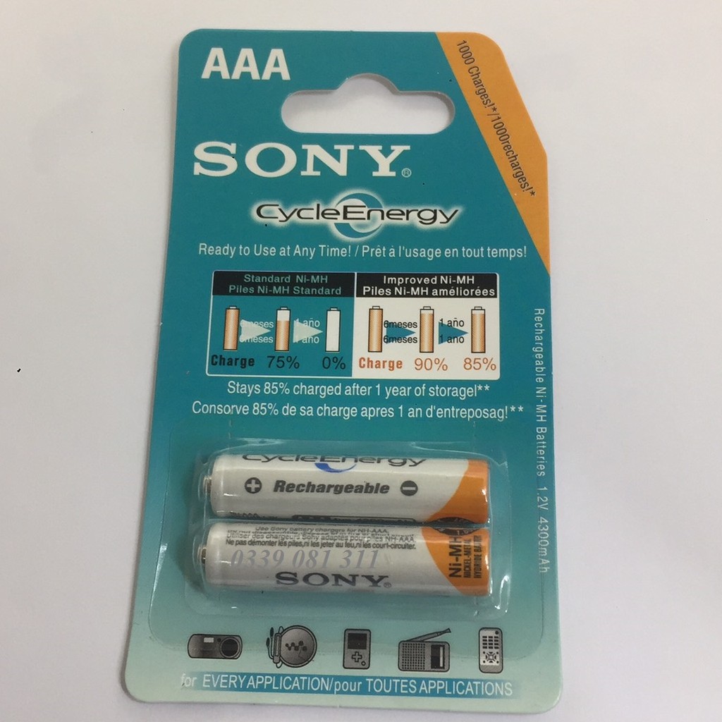 Vỉ 02 Pin sạc AAA Sony Cycle Energy dung lượng lớn, thời lượng sử dụng lâu, giúp bạn tiết kiệm chi phí.- Pin cho phép bạn sạc đi sạc lại tới 1000 lần, tương đương với 1000 pin AAA thông thường (Một phép tính đơn giản : 1000 lần sac với giá 35.000 đ chắc chắn sẽ lợi hơn pin thường 3000đ/đôi x 1000 = 3.000.000 đ).