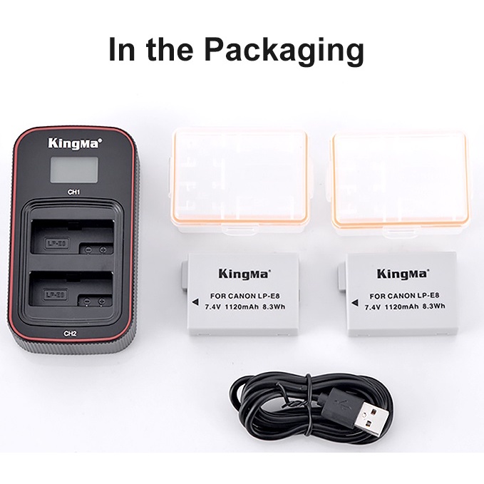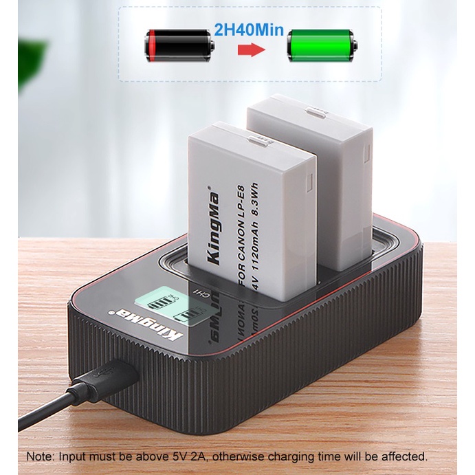 Kingma LP-E8 có dung lượng thực 1120mAh/1 viên cho thời gian sử dụng lâu hơn.Pin cho máy ảnh Canon LP-E8 Kingma thích hợp với máy ảnh Canon như 550D, 600D, 650D, 700D, 800D…Cục sạc đôi có cổng sạc vào là cổng Micro USB tiện dụng giúp sạc 2 viên pin LP-E8 cùng một lúc nhanh chóng, sạc đôi có vạch hiển thị báo 2 trạng thái sạc pin và đầy pin và tự ngắt khi pin đã được sạc đầy.