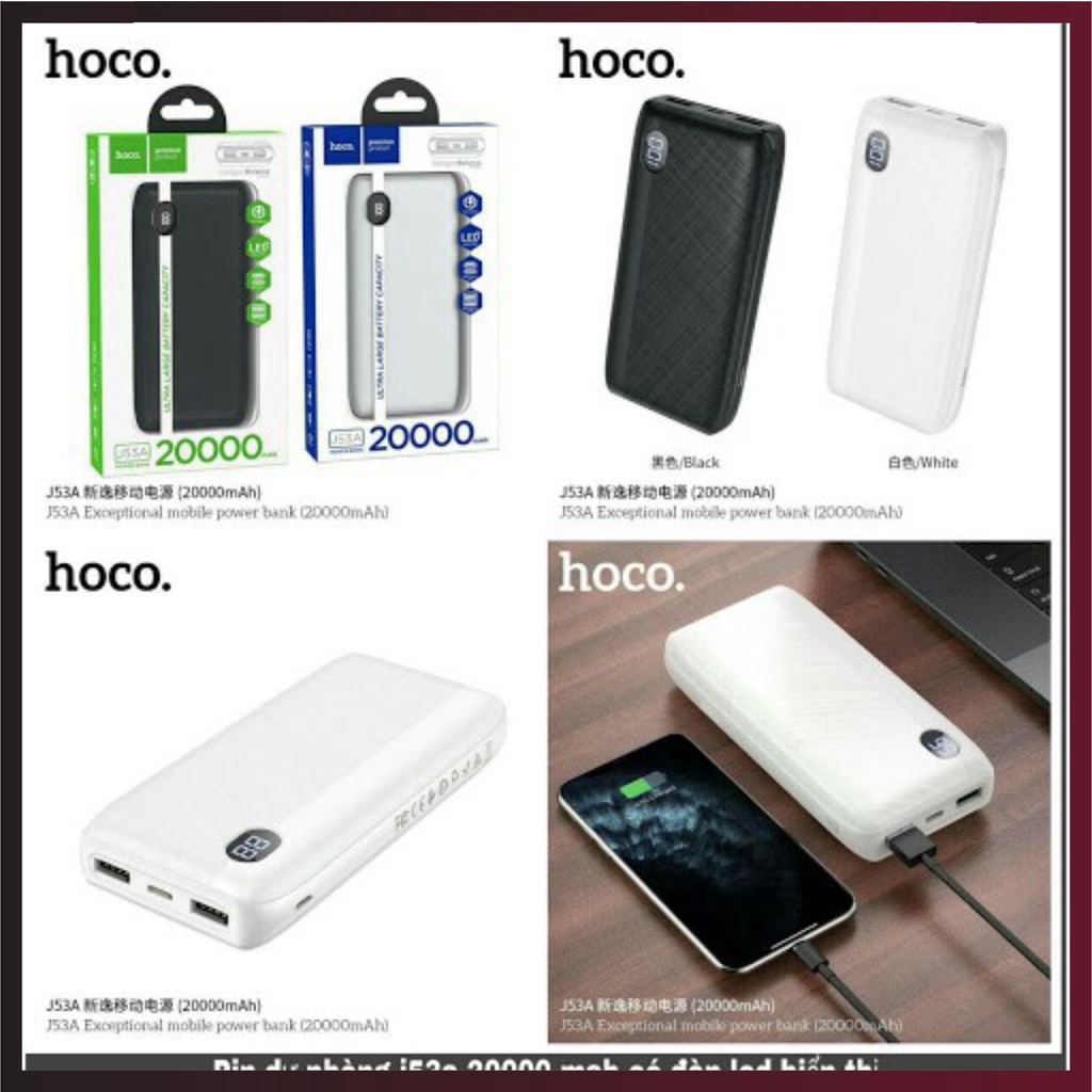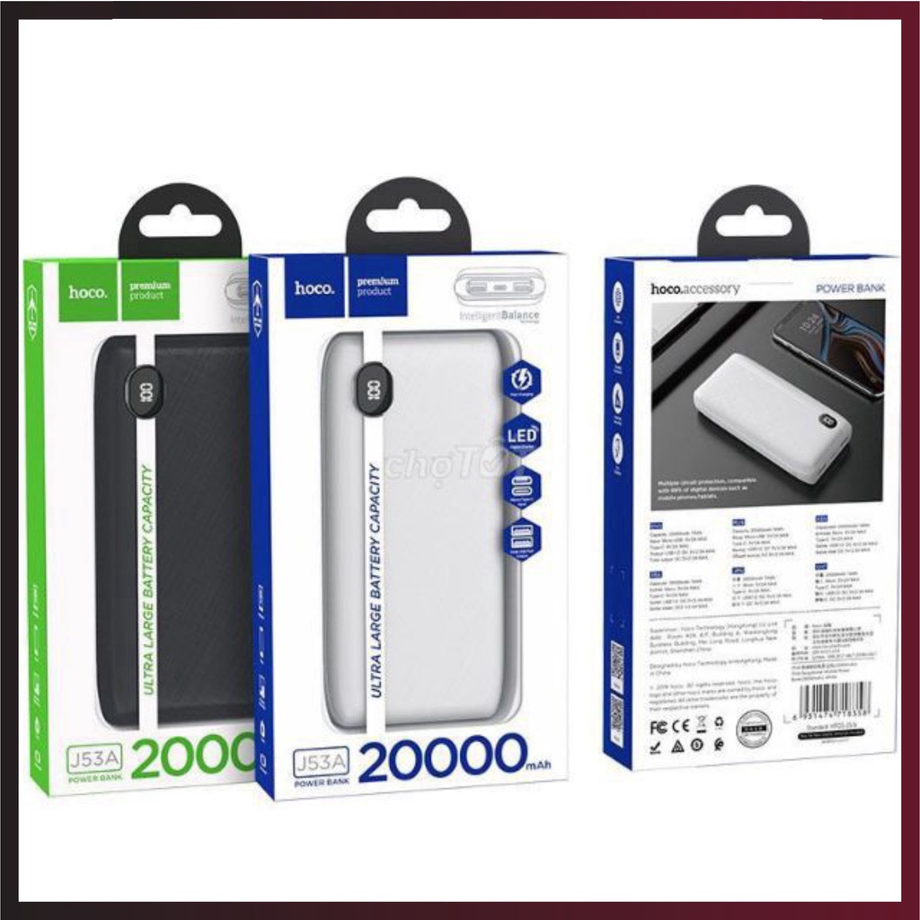 - Pin sạc dự phòng 20000mAh Hoco J53A nhỏ gọn sang trọng với dung lượng lên tới 20.000mAh nhưng thiết kế lại khá nhỏ, gọn, rất thời trang, sang trọng với chất liệu giả da cao cấp bọc ngoài như 1 chiếc ví và cực kỳ an toàn là sự lựa chọn hoàn hảo cho bạn. Với chiếc pin J53A, bạn có thể yên tâm cho những chuyến đi dài ngày tràn đầy năng lượng.