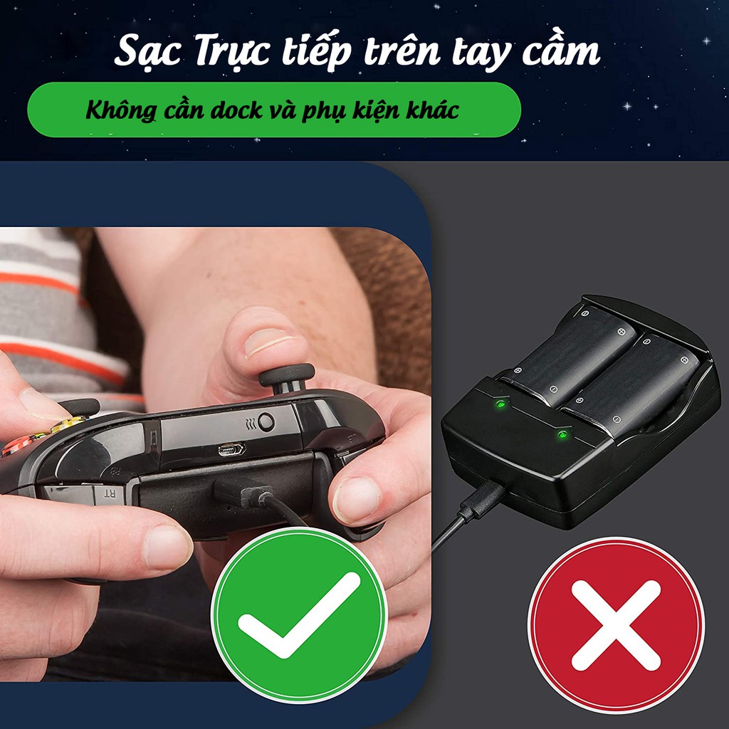 - Với bộ 1 Pin và 1 cáp xbox chính hãng ( nếu mua kèm hoặc có sẵn trong bộ fullbox ) cắm sạc cổng USB cho tay cầm XBOX của bạn có thể vừa sử dụng và vừa sạc cực kì tiện lợi mà không cần phải chờ pin đầy.Do đó với bộ Play & Charging Kit này bạn có thể tiết kiệm được rất nhiều chi phí cho Pin. Thông thường với 1 đôi pin tiểu AA bạn chỉ có thể chơi game tối đa trong vòng 1 tuần.