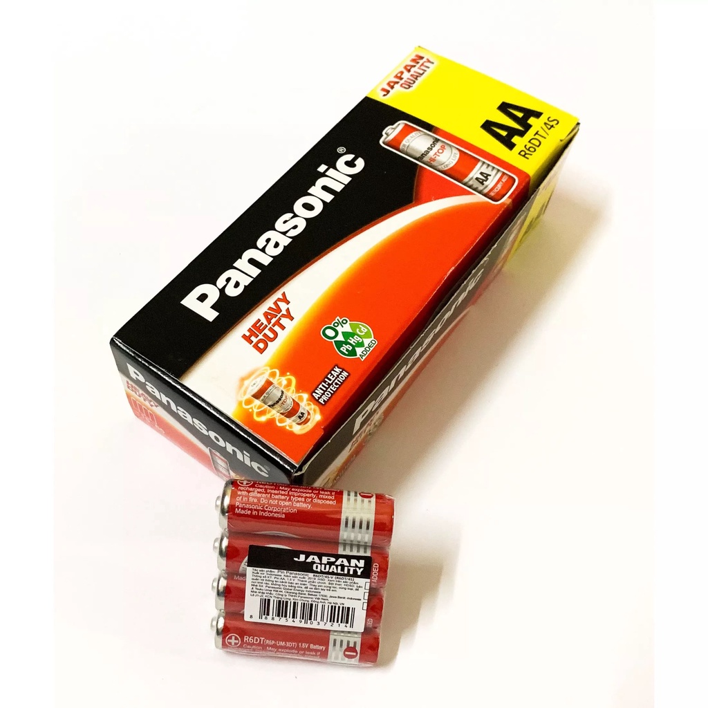 Pin PANASONIC AA R06DT/4S ( màu đỏ ) chất liệu Carbon là dòng pin giá rẻ của hãng PANASONIC, pin chuyên được sử dụng trong các thiết bị điều khiển điều, đồ chơi , đồng hồ , máy đo, và nhiều thiết bị khác. Pin tiểu PANASONIC được sản xuất tại Indonesia công nghệ Nhật Bản. Là 1 trong những hãng pin phổ biết nhất hiện nay trên thị trường Việt Nam, Pin được phân phối tại nhiều cửa hàng siêu thị trên toàn quốcPin có hạn sử dụng 3 năm, năng lượng điện ổn định và gần như 100% không bị chảy nước khi sử dụng giống như pin con thỏ